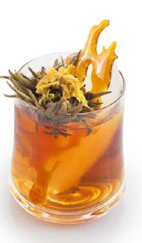 Wszystkie składniki wlewamy na lód do szklanicy barmańskie i stirujemy (mieszamy). Następnie przelewamy do szkła typu short, podając całość na bryłce lodu. Dekorujemy subtelnym dodatkiem karmelu oraz kwiatem herbacianym.