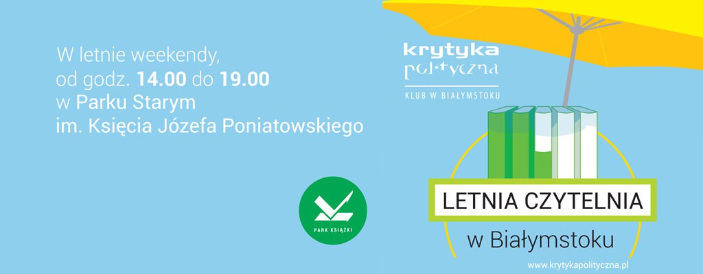 Klub Krytyki Politycznej w Białymstoku już po raz drugi zaprasza w pięć wakacyjnych weekendów do letniej czytelni książek. Do wspólnego czytania wybranych lektur organizatorzy zapraszają wszystkich chętnych. Mile widziane jest odwiedzanie czytelni również z dziećmi.