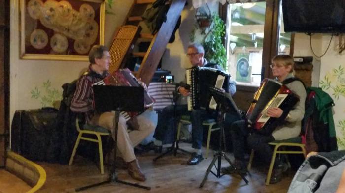 Dojechaliśmy do „Karczmy za Płotem”. Parking duży, miejsca wystarczy na kilkanaście samochodów co najmniej, choć trzeba uważać, żeby go nie minąć, bo wjazd jest dość wąski. Już od progu – ku naszemu zaskoczeniu – przywitały nas dźwięki na żywo granej muzyki. Jak się okazało to miejscowe trio akordeonowe Akord, które od lat w każdą niedzielę przygrywa „do kotleta”. I tu trzeba przyznać, że robią to naprawdę dobrze. Generalnie z miejsca duży plus. A szczególnie, że na wejściu trio zagrało nam słynne „Podmoskownyje wieczera”.