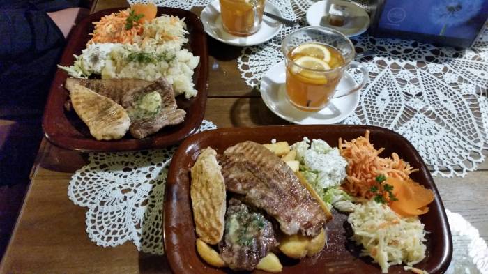 Tak na marginesie to nie mamy lotniska ,nie mamy uchodźców, nie mamy dobrego połączenia ze światem, nie mamy zamachów, nie mamy powodzi (oprócz Aqua Parku Antoniuk po ulewie), to przynajmniej burza nam trochę podniosła adrenalinę. I git!. Zamówienie złożyliśmy na bogato. Ale ogólnie rządziła karkówka i schabowy. Na początek jednak postanowiliśmy się uraczyć czymś na rozgrzewkę i była to… nie, nie wódka, ale herbata – idealna na tę porę roku. Miód malina! Czarna herbata z pomarańczami, goździkami i miodem. W życiu lepszej nie piliśmy. Nawet dla samej herbaty warto pojechać do Karczmy za Płotem.