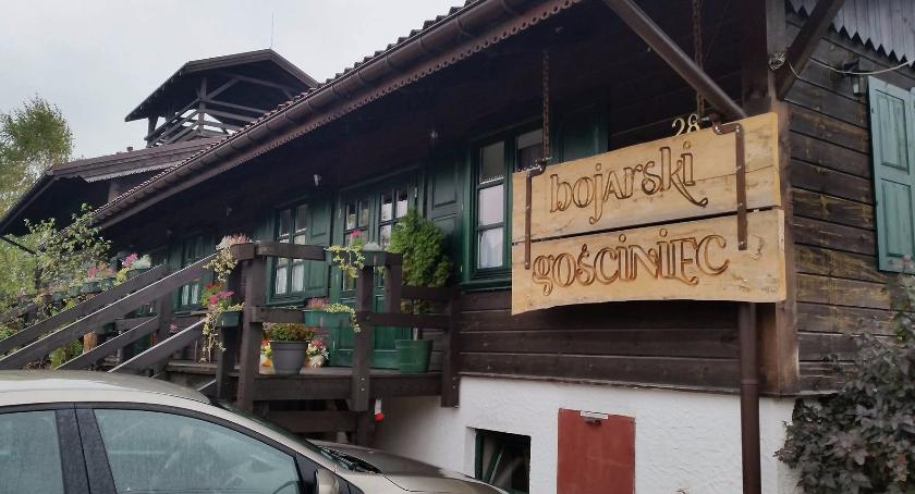Trzeba przyznać, że „Bojarski Gościniec” zrobił na nas bardzo pozytywne wrażenie. Pięknie położony, naokoło sama zieleń, z eleganckim tarasem i fajnym widokiem. Wnętrze przytulne, wszystko w drzewie, w oddali muzyka nawiązująca do wschodniego charakteru miejsca, a także elementy przypominające o dziedzictwie kulturowym ludzi zamieszkujących te tereny. Wszystko to pozwala nam bardzo solidnie ocenić cały ten kompleks. Warto też dodać, że w Gościńcu znajduje się także malutki hotel, a w okresie letnim istnieje możliwość wynajęcia kajaków. Jest miejsce zabaw dla dzieci, gdy ciepło – można na pewno palić ogniska. Reasumując, gorąco polecamy Bojarski Gościniec! My w każdym razie serdecznie podziękowaliśmy za przyjęcie, jedzenie i miłą obsługę.