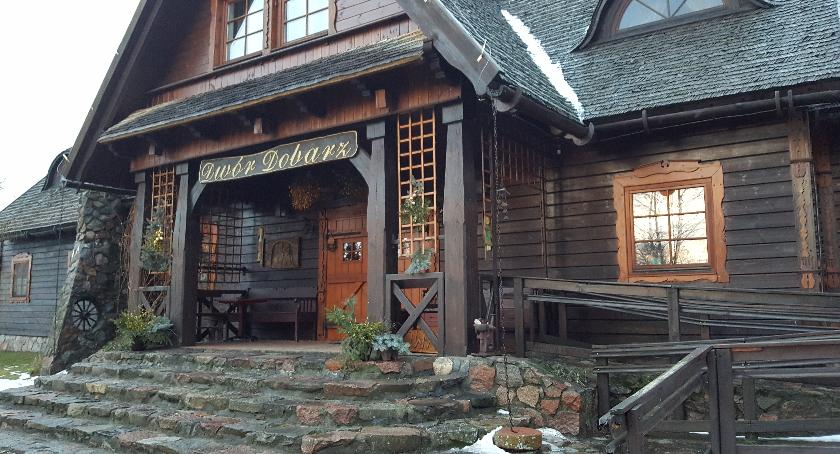 Okolica przepiękna, bo Dwór Dobarz znajduje się w zasadzie w Biebrzańskim Parku Narodowym. Pełno zieleni, drzew, a sam dwór zrobiony jest z bala, przykryty do tego dwuspadowym dachem z wióra osikowego. Wygląda jak dawny, klasyczny polski dwór. Na zewnątrz znajdziemy tablicę informacyjną o leśniku i miłośniku bagien – Kazimierzu Glinka – Janczewskim. A już nad samym wejściem wisi jemioła. Na ścianach przy drzwiach wejściowych świątki – czy cokolwiek to jest. Dla nas drewniane figurki wyglądają jak świątki. Wewnątrz przytulnie, ciepło, bo wszystko drewniane i z drzewa. Stoły z białymi obrusami zachęcają do rozgoszczenia się. Lokal ma wygodne, duże krzesła, albo dla miłośników twardszego siedzenia – drewniane ławy.
