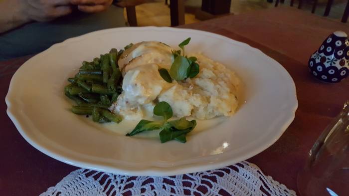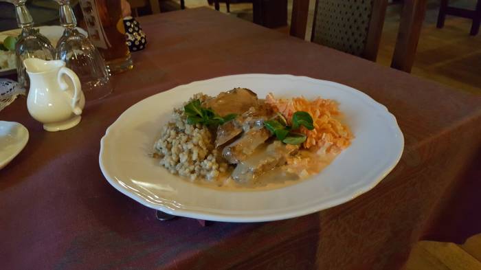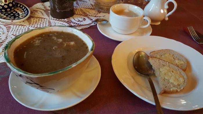 Pani poleca nam zupę chlebową. Szczerze, to nigdy wcześniej nie jedliśmy takiej zupy. Jak to? Zupa z chleba? – pytamy. Okazuje się, że z prawdziwego chleba gotowana. Ryzyk, fizyk. Bierzemy. Przy pierwszych łyżkach, zdania podzielone. A to za mało słona, a to za mało pieprzu, a to jakaś taka nie bardzo. Ale podchodzi znów do nas pani z obsługi i mówi, że zupę najlepiej doprawić po swojemu. Dlatego na stole stoją przyprawy, bo każdy lubi inną. Doprawiamy i … niebo w gębie. Nie było żadnego narzekania na zupę chlebową. Może nie dorównuje ona soliance z Kruszynian, ale jest pyszna i zjadamy do ostatniej kropelki.
