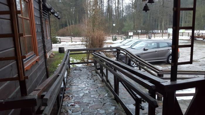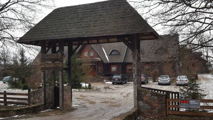 Na razie skupmy się na tym, co istotne, czyli – jak zwykle zakręciliśmy globusem Polski i wypadło nam na obiad jechać gdzieś w kierunku Augustowa, więc bez chwili namysłu pojechaliśmy… na Trzcianne. Miasteczko to niedaleko położone za pierwszą strefą dolarową, którą są Mońki. Drugą strefą, jakby ktoś nie wiedział – jest Grajewo. Na tym strefy dolarowe w regionie się kończą. Niezależnie od wszystkiego, do Dworu Dobarz, trzeba podjechać kilka kilometrów za Trzcianne. Tam już droga nawet nie jest we fragmentach, ale w strzępach. Przynajmniej taka była zimą. Jechaliśmy okrutnie wolno, bo cała była pokryta lodem we wszystkich brakujących fragmentach jezdni.