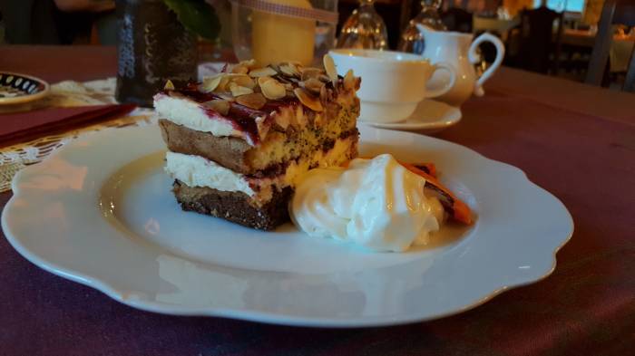 Przyznajemy też bez bicia, że wewnątrz jest czysto i wszystko wygląda na bardzo zadbane. I przyznajemy jeszcze, że najedliśmy się do syta, ale… postanowiliśmy przyczepić się do deseru. Ot, tak dla zasady. Zamówiliśmy ciasto o nazwie roztrzepaniec czy rozbabraniec, jakoś tak w każdym razie. Uznaliśmy, że ciastko o takiej nazwie raczej nie zapowiada niczego dobrego. A tu zonk! Było przepyszne. Jeśli mielibyśmy ocenić cokolwiek z potraw najwyżej, to właśnie deser. Choć w ogóle wizyta okazała się być bardzo udana.