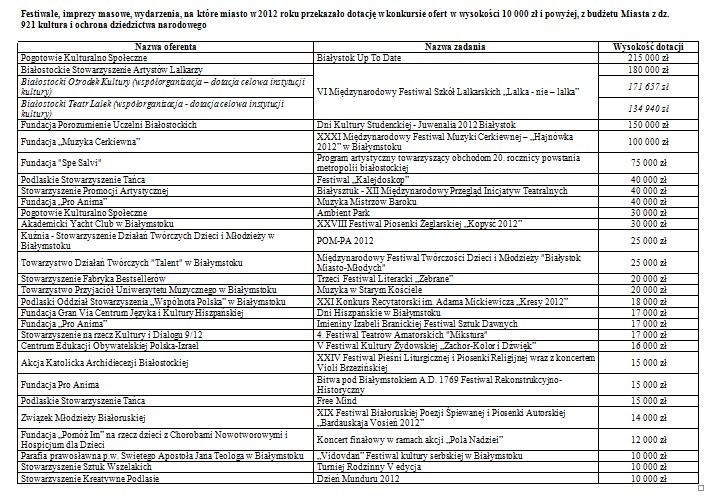 Miejskie Biuro Komunikacji Społecznej przesłało mi listę wydarzeń, na które miasto przez ostatnie trzy lata wydawało kwoty niemniejsze niż dziesięć tysięcy złotych (poniżej tylko ubiegły rok) oraz budżety trzech największych instytucji kulturalnych w Białymstoku. Warto dodać, że miasto dofinansowało w tym roku, również instytucję Urzędu Marszałkowskiego – Operę i Filharmonię Podlaską (2 mln zł). Po przejrzeniu listy widzę trzy solidne porażki Urzędu Miasta. Pierwsza to brak festiwali: „Filmvisage” (powyżej 500 tys. zł) i „Pozytywne Wibracje” (1,5 – 2 mln zł). Porażką nie jest ich brak, a w ogóle pojawienie się na liście. Oba miały ogromne budżety, ale żaden nie rysował spójnego, powszechnie jasnego wizerunku miasta. Poza tym miasto wydając na te imprezy pieniądze zainwestowało w zewnętrzną markę i dziś nic z tego nie ma i nic mieć w przyszłości nie będzie. My zainwestowaliśmy w cudze, komercyjne marki, a dziś nie mamy do nich żadnych praw. Porażka numer dwa to budżet Białostockiego Teatru Lalek i imprez powiązanych z tą instytucją.
