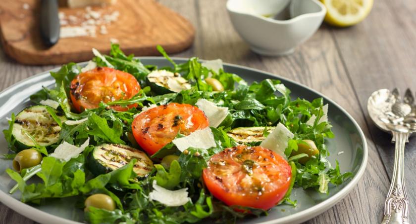 Cukinię i pomidory dokładnie umyć i osuszyć. Następnie cukinię pokroić w plastry, a pomidory na połówki. Oprószone przyprawami warzywa ułożyć na ruszcie i grillować. Na talerzu ułożyć liście sałaty, dodać cukinię, pomidory i odsączone oliwki. Sałatkę skropić dressingiem.
