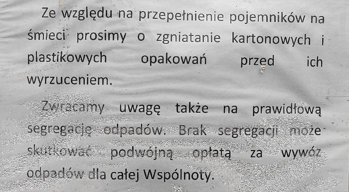 Zwracamy uwagę na prawidłową segregację odpadów. Jej brak może skutkować podwójną opłatą za wywóz odpadów dla całej wspólnoty - takie komunikaty widnieją na wielu śmietnikach i klatkach schodowych w Białymstoku. Umieszczają je i spółdzielnie mieszkaniowe i wspólnoty mieszkańców.
