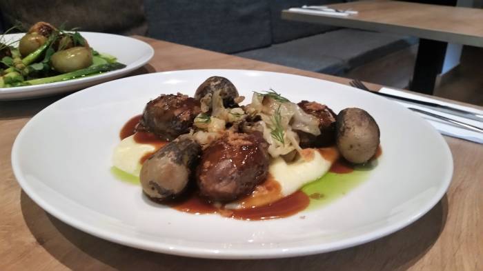 Najpierw policzki wieprzowe, wędzony ziemniak, młoda kapusta. Cena - 32 zł. Tak podaje karta menu. Z tym że to nie wszystko. Pani kelnerka wyjaśniła, że spis wszystkich składników musiałby zająć co najmniej kilka linijek tekstu. W daniu tym znajdziemy więc np. cydr, nutę kminku (?), posypkę pangrattao, ponpuree, oliwę estragonową... Dodajmy, że wędzony ziemniak opalany jest tuż przed podaniem. Z kolei smaczna kapusta - podlewana masłem.