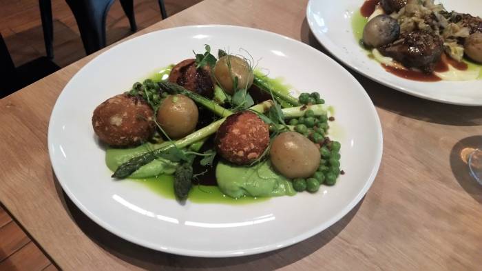 Smakujemy dalej: na stolik trafia kaczka bonbons, orientalny jus z kaczki, groszek, młody ziemniak, miso za 36 zł. Wspomnijmy, że kaczka była w formie kulek/gałek. Pyszne, wyróżnić warto wyrazisty smak sosu - to demi-glace kaczy, długo gotowany sos z dodatkiem czerwonego wina i przyprawy pięciu smaków. Oprócz tego, że mamy ziemniaka, to jest jeszcze puree, wymieniony groszek pod dwiema postaciami - puree oraz groszku cukrowego do ozdoby, szparagi. No i panko, w której panierowana była kaczka - to japońska bułka tarta, która nie przepuszcza tłuszczu do środka potrawy.