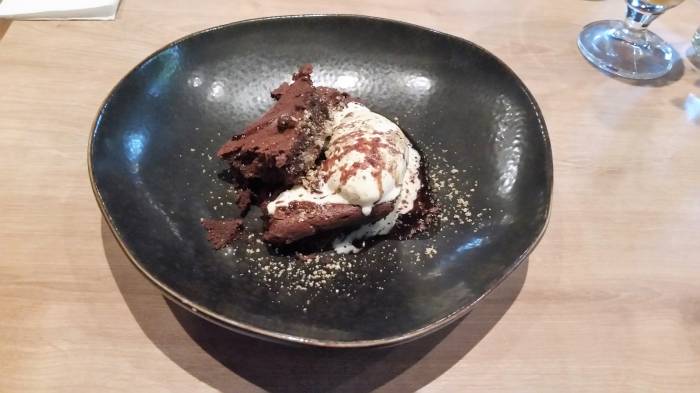 Desery jeszcze udało się zmieścić, były wyborne. Pierwszy w nich to sprasowana beza, lody śmietankowe, truskawki, lubczyk w postaci oliwy i szczaw. Drugi był bardzo czekoladowy - brownie, gorgonzola w postaci lodów, pikantne wiśnie w porto, oliwa z pestek dyni.