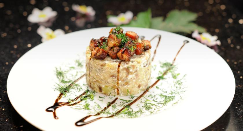Na koniec możemy uformować na talerzu walec z tak przygotowanych ziemniaków, położyć na wierzchu usmażone kiełbaski, posypać koperkiem i polać odrobiną sosu balsamicznego.