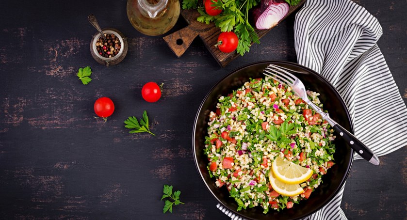 Tabbouleh z kolei to nic innego jak libańska wariacja lekkiej sałatki warzywnej, składająca się z pomidorów, zielonych ogórków, papryki, dużej ilości pietruszki i mięty z dodatkiem kaszy bulgur. Wyśmienita jako dodatek do obiadu lub na lekkostrawną kolację.