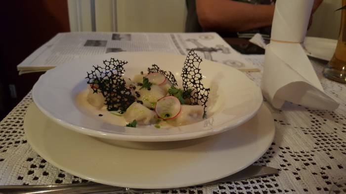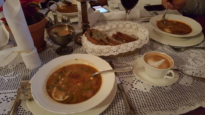 Lokal wewnątrz ładny. Nawet bardzo ładny. Dużo drzewa, cicha i przyjemna dla ucha muzyczka, ładnie ubrani kelnerzy i… jeden wolny stół. Jakby specjalnie na nas czekał. Szczerze mówiąc, kiedy widzieliśmy te ceny na zewnątrz, to liczyliśmy po cichu, że w środku nie będzie jednak dla nas nawet taborecika. Ale były… krzesła i wielki stół. A skoro tak, zamówiliśmy. Soliankę, soliankę, soliankę i soliankę. Jakoś inne zupy do nas nie przemawiały. Ale kiedy przyniesiono nam te solianki, one też nie przemówiły. Owszem, w smaku dobre, ale dwójka z naszej ekipki szukała łyżką, nożem i widelcem choćby kawałeczka mięsa. Druga dwójka, znalazła mięsko. Z tym, że szału nie było. Podzieliliśmy się, żeby jakoś każdy choć zębem trafił o jakieś mięso w soliance. I możemy z całą stanowczością stwierdzić, że z solianki najbardziej smakował nam zdecydowanie… chleb z czarnuszką. Pieczony na miejscu, mięciutki i pachnący. Pyszota. Reszta solianki furory nie zrobiła.