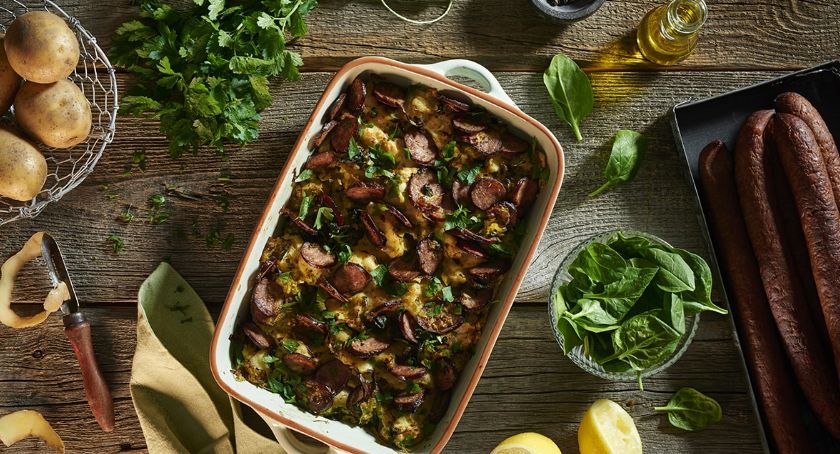 ZIEMNIACZANA ZAPIEKANKA ZE SZPINAKIEM I KIEŁBASĄ KURPIOWSKIE SPECJAŁY