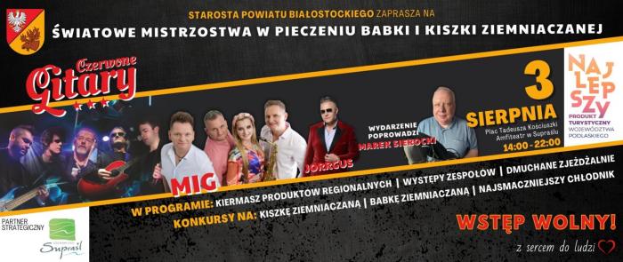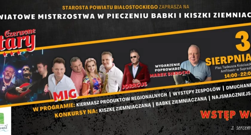 Wytwórcy babki i kiszki będą rywalizować w dwóch kategoriach, a zgłoszenia można nadsyłać do Wydziału Kultury, Sportu, Turystyki i Promocji w Starostwie Powiatowym jeszcze tylko do 19 lipca. Swoje wyroby zaprezentują w Supraślu lokalni producenci, w tym Koła Gospodyń Wiejskich i wytwórcy rękodzieła – tu zgłoszenia są przyjmowane do 15 lipca. Muzycznie czas umilą występy zespołów disco-polo MIG i Jorrgus, jako gwiazda zagrają doskonale znane Czerwone Gitary. Dzieci za darmo będą mogły pobawić się na tzw. dmuchańcach.