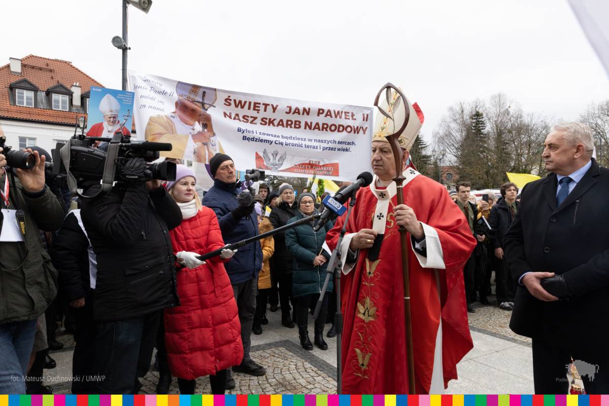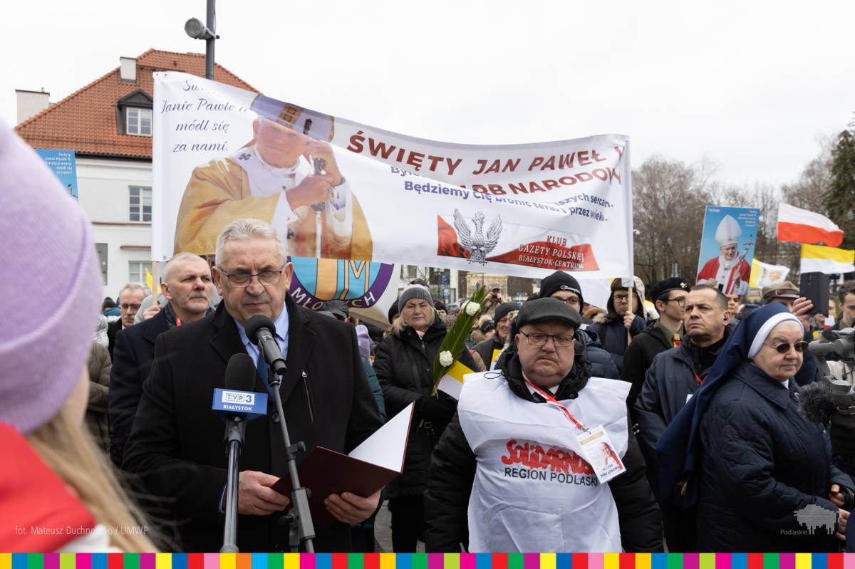 Tysiące ludzi wzięło udział w przemarszu, jaki w niedzielę, 2 kwietnia, odbył się w centrum Białegostoku w podziękowaniu za blisko 27-letni pontyfikat św. Jana Pawła II. Uroczystości upamiętniające to wydarzenie zorganizowali: NSZZ „Solidarność” Region Podlaski oraz Klub Więzionych Internowanych i Represjonowanych (WIR). Wzięli w nich udział m.in.: marszałek Artur Kosicki, wicemarszałek Sebastian Łukaszewicz oraz członek zarządu Wiesława Burnos. W tym samym czasie prezydent Białegostoku podawał na Twitterze hejterskie wpisy Romana Giertycha.